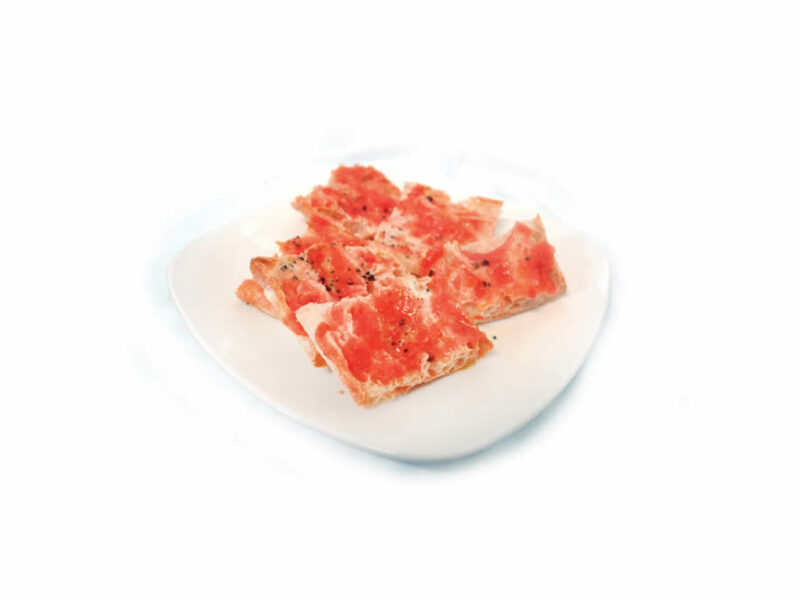 Pan de cristal con tomate, aceite arbequino y sal maldon negra
