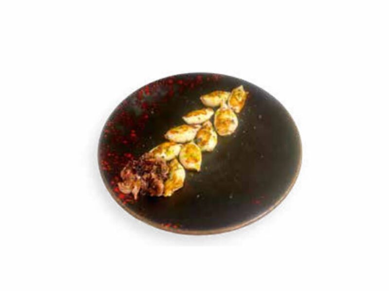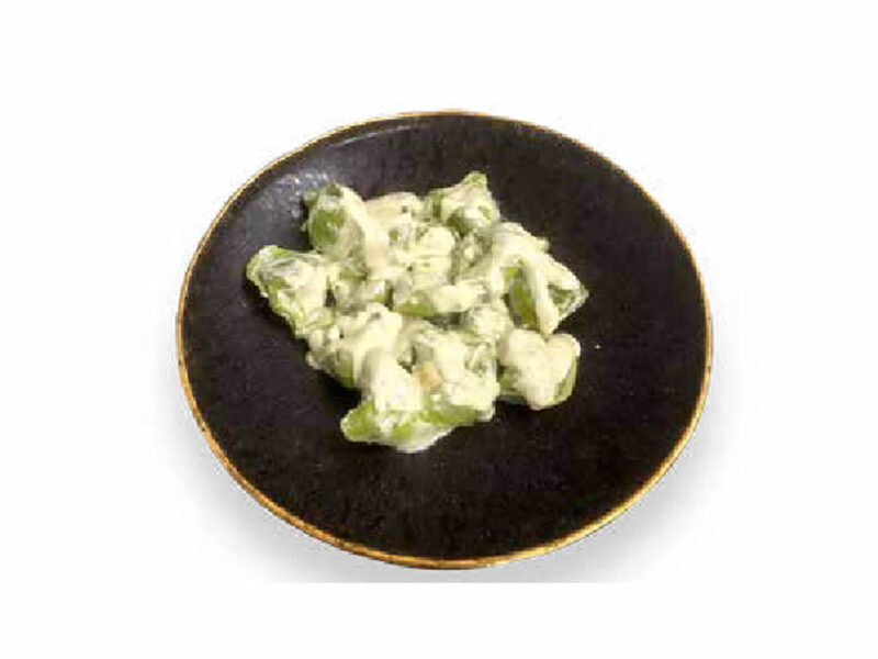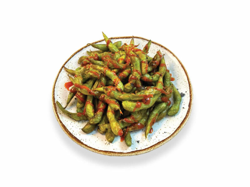 Edamames fritos con salsa kimchi y sal negra