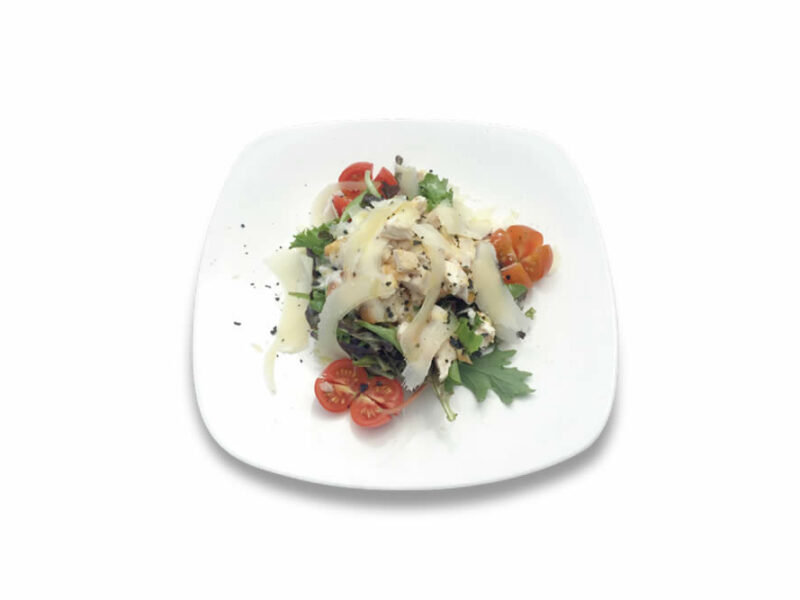 Ensalada césar con pollo, virutas de queso parmesano y tomates cherry