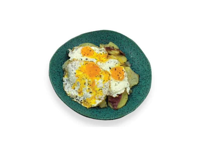 Huevos rotos con patatas panaderas y jamón ibérico