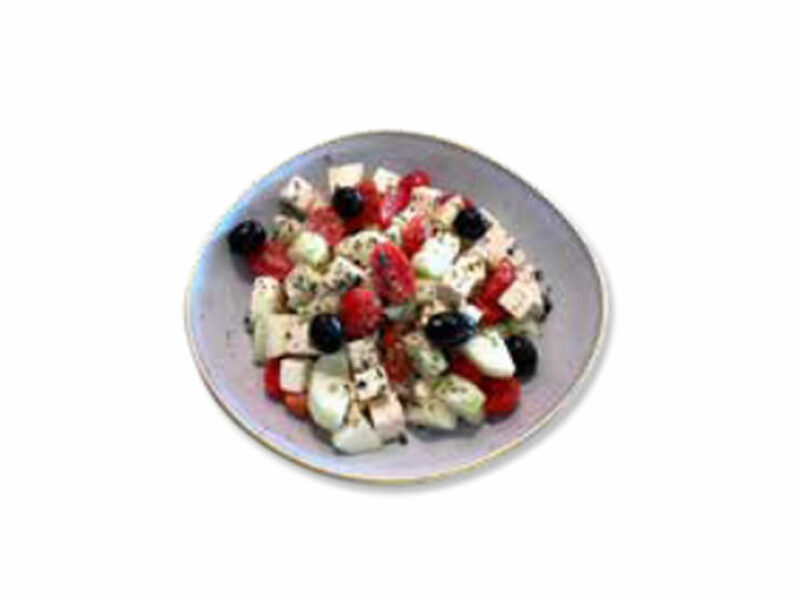 Ensalada griega con queso feta, pepino, tomate, aceitunas negras, orégano
